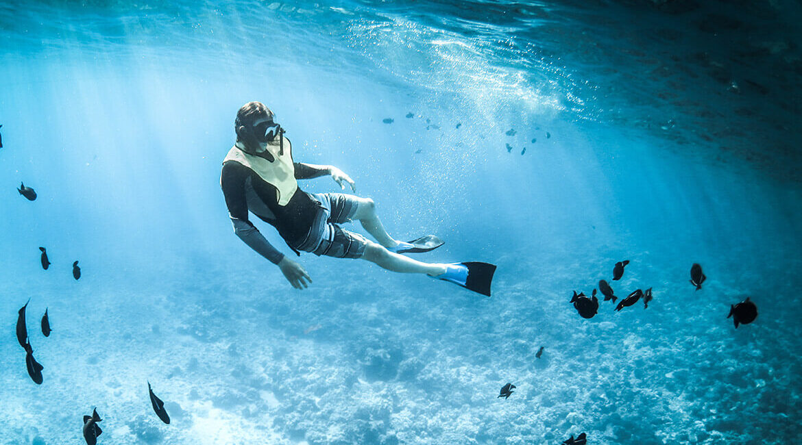 Also, a number of marine animals are easier to see and get close to when we don’t exhale bubbles, including whale sharks and dolphins. When traveling, it allows us to take a look below the waterline without having to bring or rent a lot of gear. For rescue scenarios, we don’t always have the luxury of dive gear and may need to assist a diver using only our fins, mask and snorkel. Snorkeling is very useful when taking non-divers out to experience the underwater world.